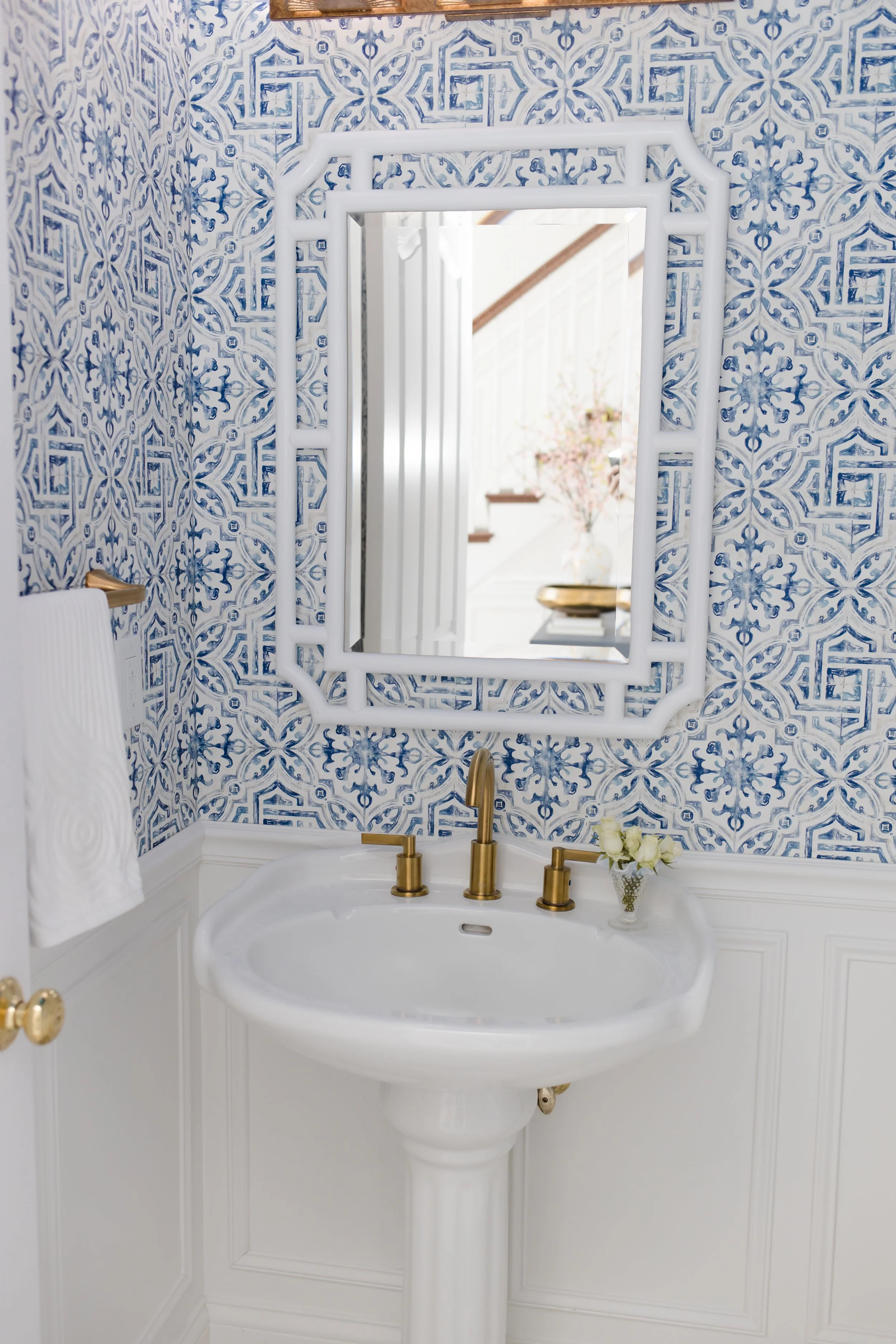 A powder room is an opportune space to express your family's style or even add a little whimsy to your home's design. From using wallpaper, to bolder colors, and/or captivating art, our team at Flourish Interiors loves to design unique powder rooms. We engage our clients in the process, learn about their favorite colors and interests and then creatively bring that spirit into the space. Powder rooms are also a space for house guests to have a moment to themselves and absorb your style in earnest, so this is even more reason to make the space full of personality and character. This powder room from our Grand Millennial Estate features colorful geometric wallpaper, bold abstract artwork, a bamboo mirror, and a brass peacock toilet paper dispenser to add the pizazz and personality we recommend.